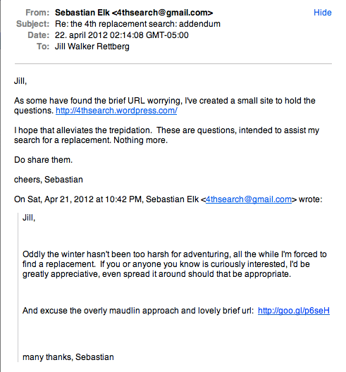 A few days ago, I received an odd email, apparently a followup to a first mail that I don’t think I ever received. I almost deleted it instantly as spam, but after a second glance I decided to try that URL. It is written by a man who is seeking his replacement. What he does, exactly, is however not made clear. Look, here’s the email:
