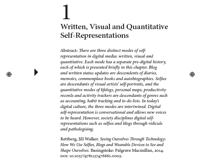 In working with this material I’ve become particularly fascinated with the ways in which machines are increasingly writing our diaries for us, whether through automated cameras like the Narrative Clip, through the wearable devices that allow the quantified self movement to generate visualizations and analyses that help them improve their lives, or by the automated data gathering performed by apps like Swarm, Moves or OptimizeMe, web services like Facebook or Google or our phone service providers and marketers. The book thus moves from looking at digital self-representations in general to considering the relationships between people and machines, and lives and data in a much broader manner.